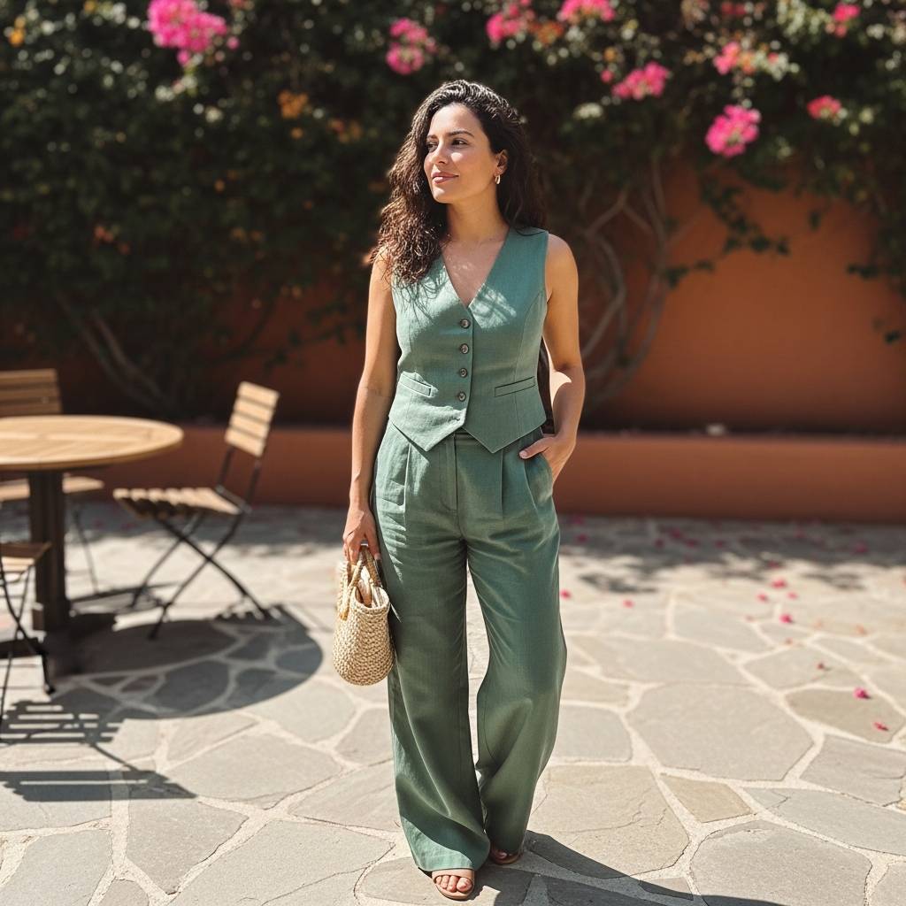 Linen is the undisputed king of summer fabrics. A matching vest and wide-leg trouser set in a neutral tone like oatmeal or sage green provides an instant, put-together look. This outfit is perfect for brunch dates or office days during a heatwave. Pair it with leather slides and a woven tote bag to complete the aesthetic. The breathability of linen ensures you stay dry and comfortable even in high humidity.