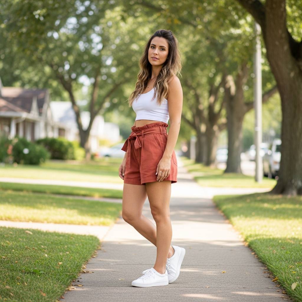 Paperbag shorts are incredibly flattering as they cinch the waist and provide a comfortable fit through the hips. Pair them with a simple ribbed crop top to balance the volume of the shorts. This outfit is youthful and fun, perfect for a summer festival or a day at the park. Choose bright colors like terracotta or mustard to embrace the season’s energy.