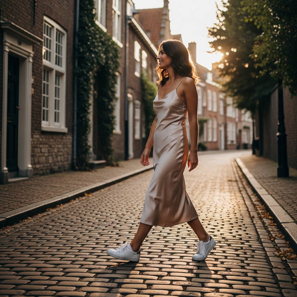 For a mix of 90s nostalgia and modern minimalism, the slip dress and sneaker combo is unbeatable. The satin fabric adds a touch of luxury, while the sneakers keep the look grounded and practical for walking. It is a great choice for exploring a new city. Layer a denim jacket over your shoulders if the evening breeze gets chilly.