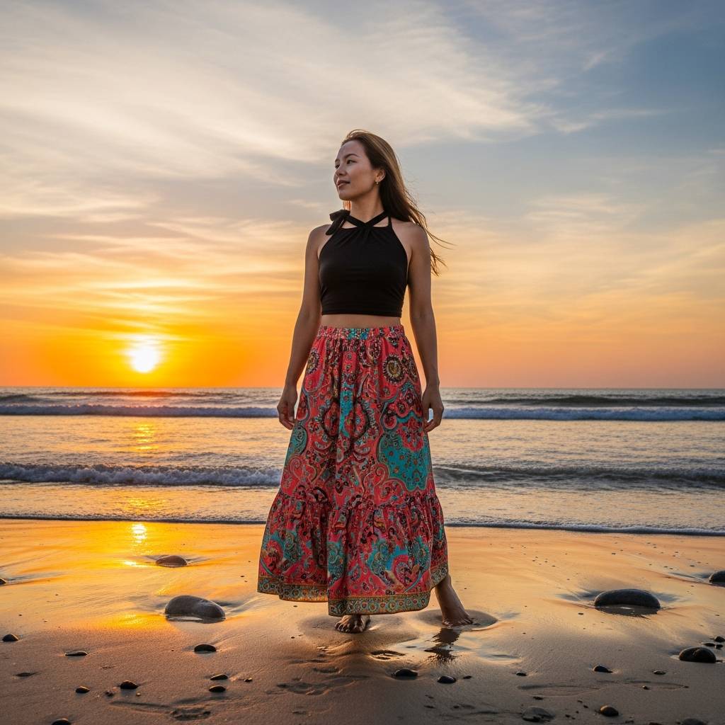 Maxi skirts are great for those who want coverage but still want to feel the breeze. A tiered maxi skirt with a boho print paired with a simple halter top creates a beautiful silhouette. This look is perfect for beach vacations or outdoor concerts. The movement of the skirt adds a dramatic flair to your every step, making it a favorite for summer photography.