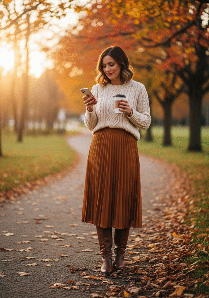 This combo gives soft, feminine fall vibes. A pleated skirt in a fall tone like wine or olive adds a romantic feel.
