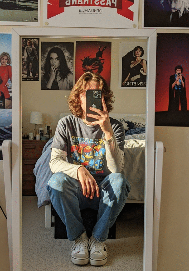 A laid-back outfit with a retro twist, perfect for everyday classes.