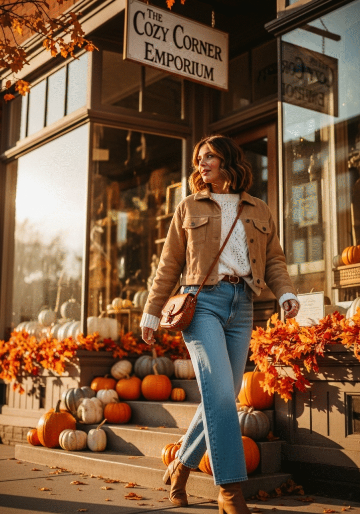 Retro charm with a cropped corduroy jacket and wide-leg jeans.
