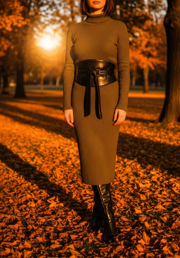 A ribbed turtleneck dress is a versatile base for fall. Pair it with knee-high boots and a belt to define the waist.