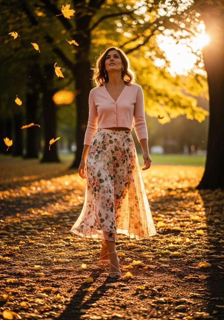 A cropped cardigan with a flowy midi skirt offers a soft, feminine look.