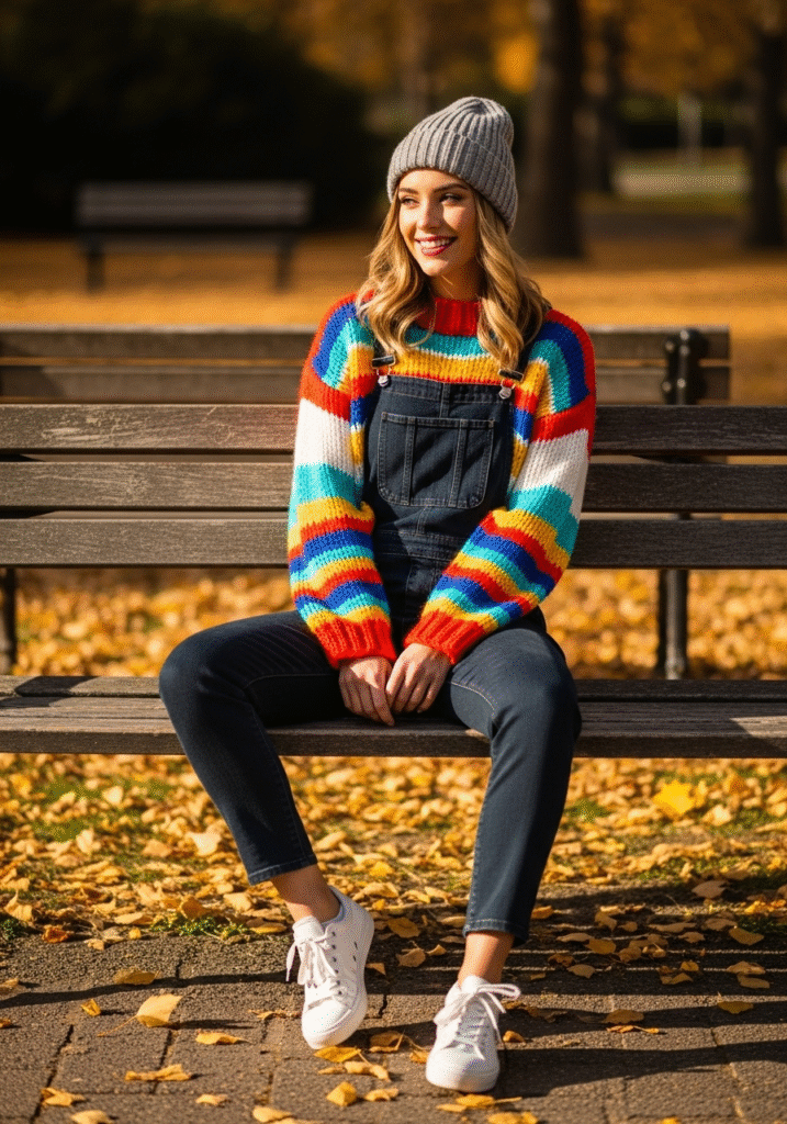 Playful fall vibes with a striped sweater under denim overalls.