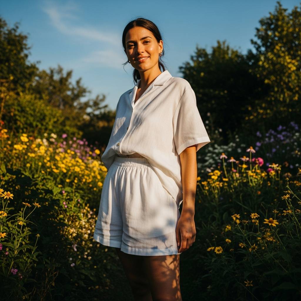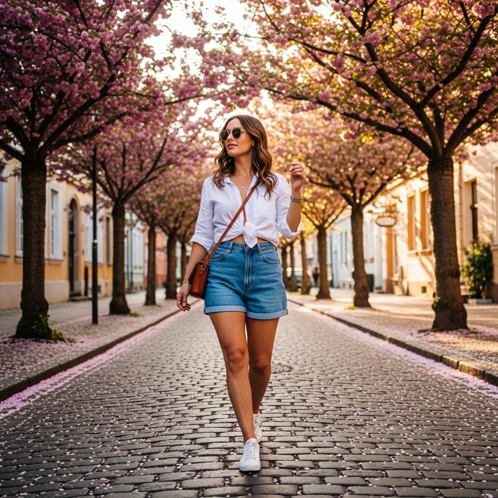 You can never go wrong with the classics. A pair of well-tailored khaki shorts and a high-quality white crew neck t-shirt is a blueprint for summer minimalism. To make it ‘chic,’ ensure the fit is impeccable—not too tight, not too loose. Tuck the tee in, add a high-quality leather belt, and finish with clean white sneakers. It is the ultimate clean-girl uniform.