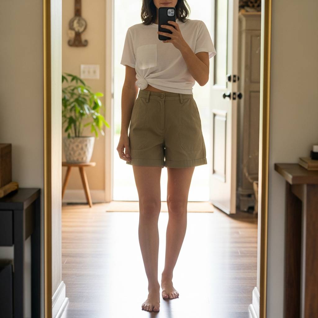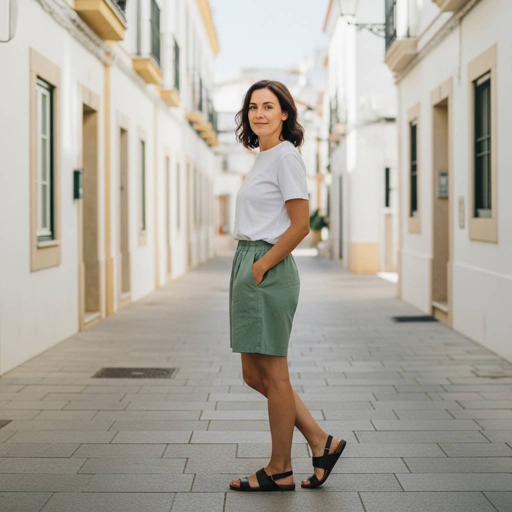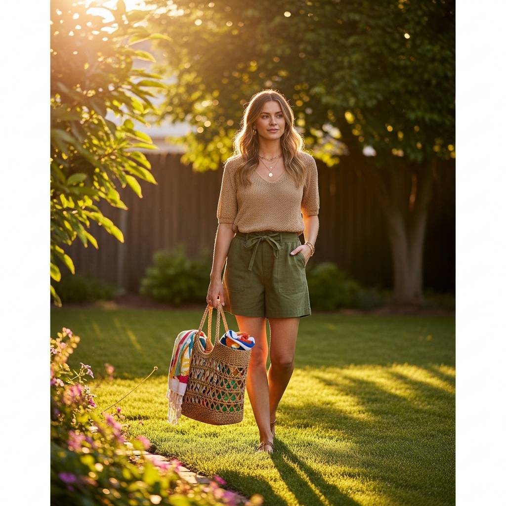 Embrace the colors of nature by pairing olive green shorts with a tan or terracotta knit top. Earthy tones are inherently minimalist and feel grounded. To elevate the look, incorporate raffia or straw accessories, such as a large tote bag or a wide-brimmed hat. This outfit feels organic and effortless, making it the ideal choice for an outdoor market visit or a casual walk in the park.