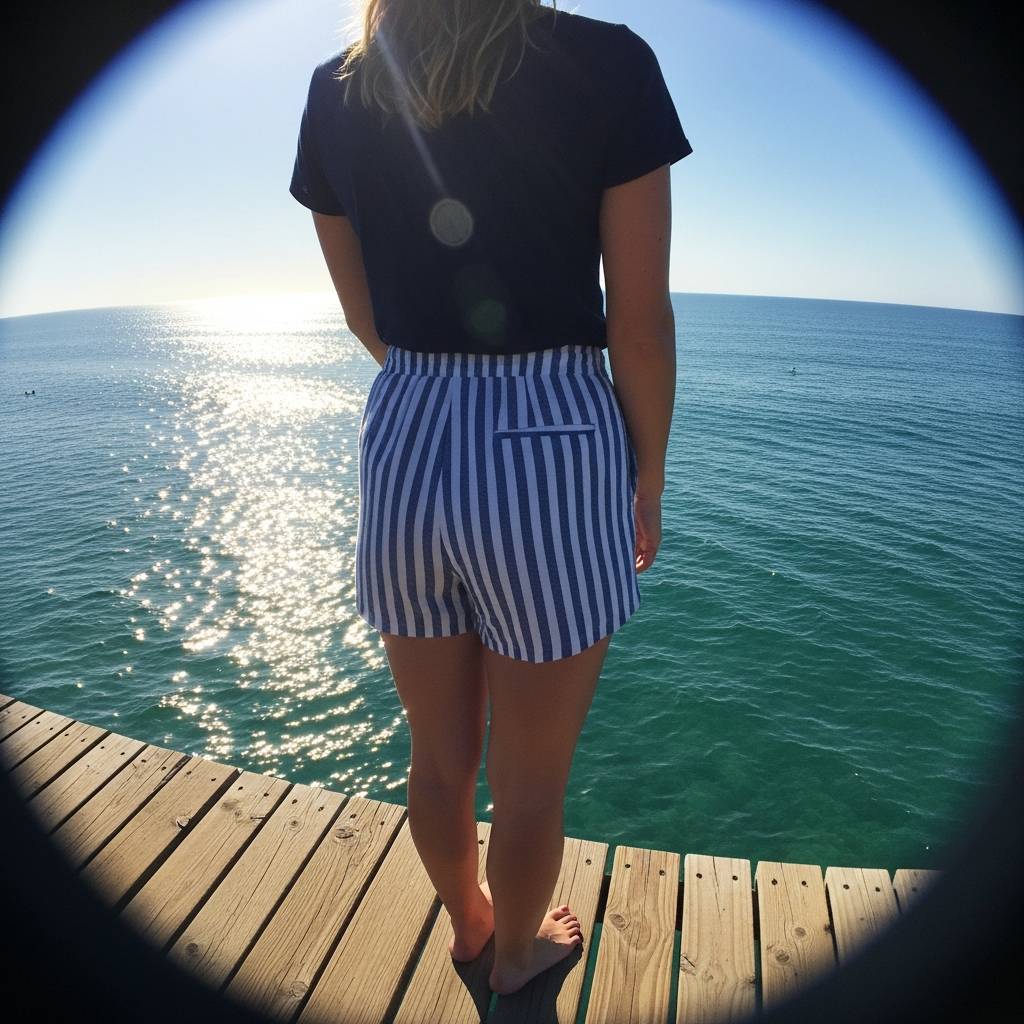 Incorporate a subtle pattern with blue and white vertical striped cotton shorts. Keep the rest of the outfit extremely simple with a crisp navy blue polo shirt or a plain white crew neck. The stripes add a touch of personality without being overwhelming. This look is classic, preppy-adjacent, and perfectly aligned with the minimal chic aesthetic for a day by the water.