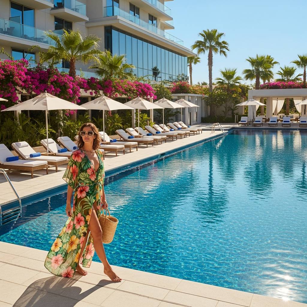 Elevate your poolside presence with a floor-length sheer floral kaftan. The way the light fabric flows behind you as you walk adds a dramatic touch to a simple bikini. Choose a kaftan with vibrant tropical prints to match the summer energy. This outfit is all about movement and elegance, making it ideal for luxury pool parties or lounging at an upscale resort. Complete the look with oversized sunglasses and a pair of embellished slides to truly embrace the high-fashion summer spirit.