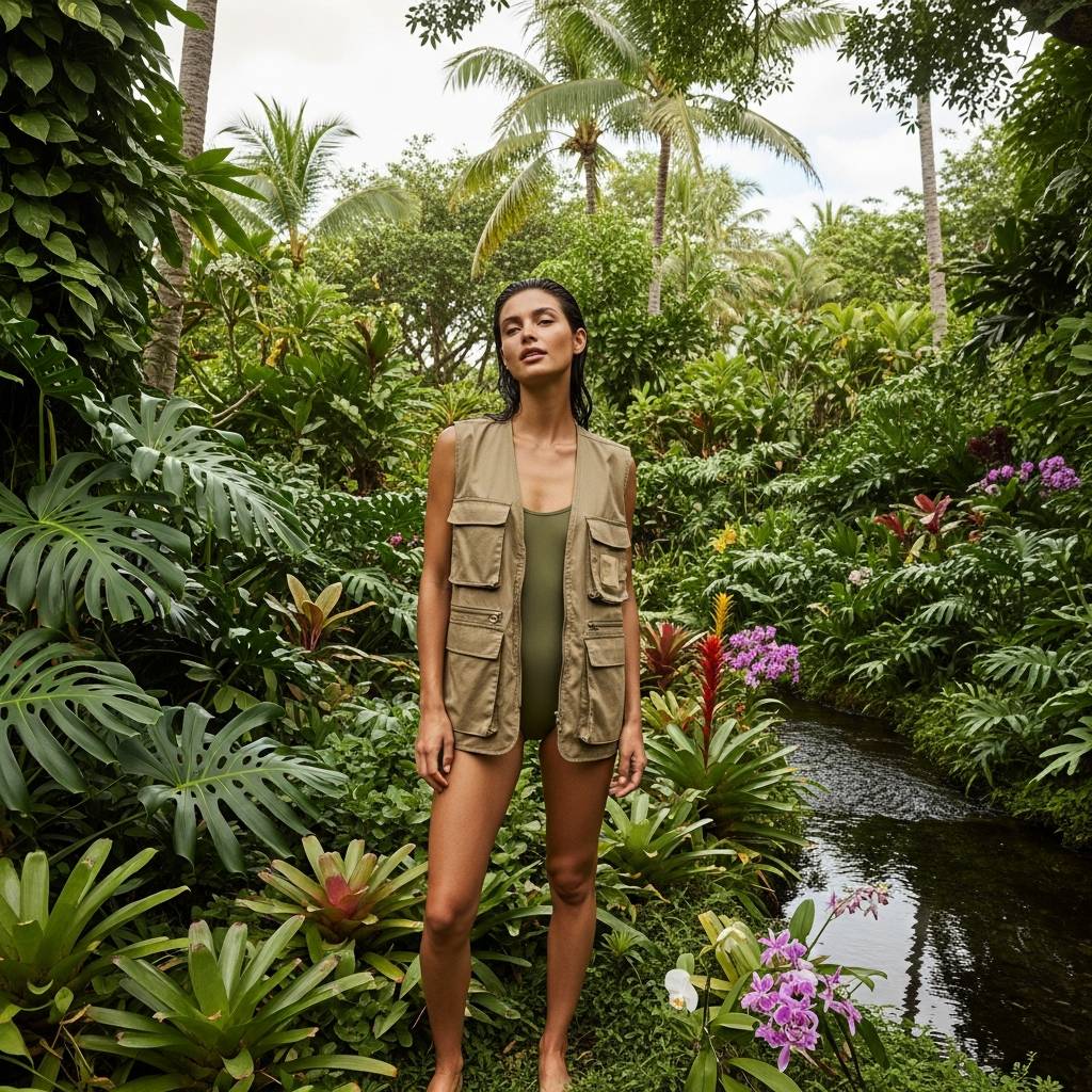 For a unique twist on beachwear, try layering a lightweight utility vest over a solid-colored one-piece swimsuit. This adds an element of ‘safari chic’ to your look, complete with functional pockets for your sunglasses or SPF. Earthy tones like olive green, khaki, or sand work best for this aesthetic. Pair it with some chunky sandals and a wide-brimmed safari hat to complete the adventurous vibe. It is a great way to add structure and interest to a simple swimsuit while staying functional.