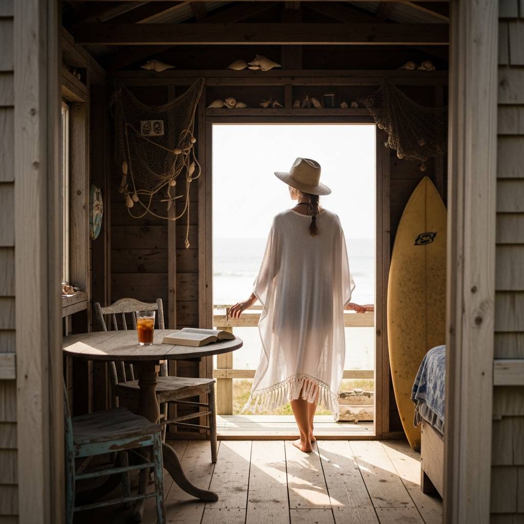 A poncho with tassel trims offers a playful and relaxed silhouette that is perfect for a day at a rustic beach bar. The tassels add movement and a handcrafted feel to the outfit. Pair this with a large straw hat and a matching straw bag to lean into the natural, organic textures of summer. This outfit is incredibly easy to throw on and off, making it a favorite for those who value convenience without sacrificing style. The loose fit ensures you stay cool and comfortable all day long.