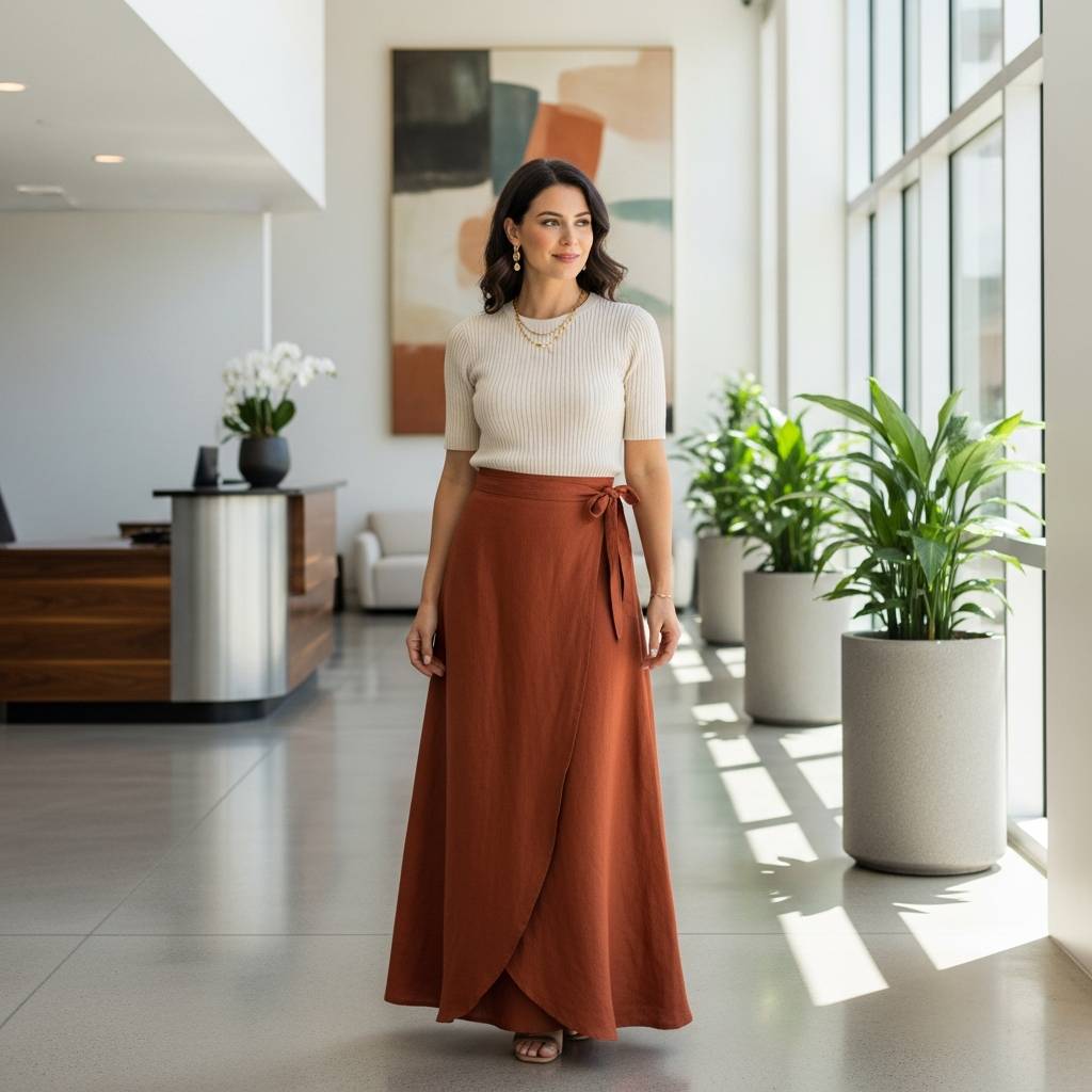 A linen wrap skirt is a versatile piece that can be dressed up or down. The wrap detail allows for a customizable fit, which is great for comfort throughout the day. In a professional setting, choose a midi length and a solid color or a subtle pinstripe. Pair it with a simple bodysuit or a tucked-in tee and a light cardigan for when the office air conditioning gets a bit too chilly. It’s a breezy, sophisticated option that works for a variety of office cultures.