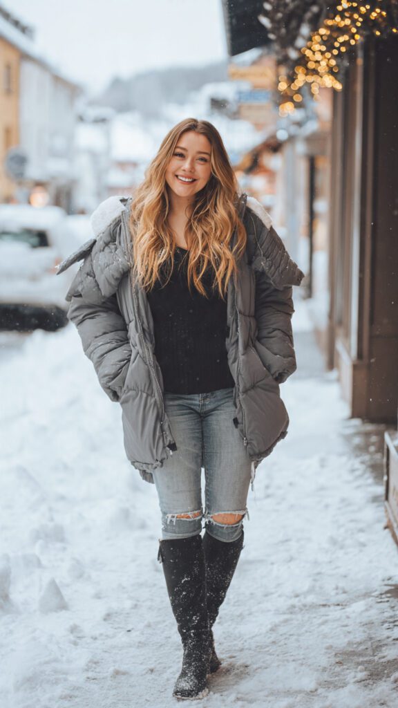 From puffer jackets to sweater dresses, chic boots to cozy scarves, these looks are meant to be attainable, realistic, and wearable for cold-weather days. Each idea focuses on enhancing curves, using flattering fits, and keeping you warm without sacrificing style.