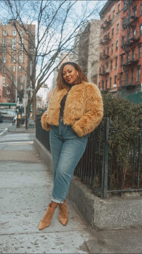 5. Faux Fur Jacket + Straight-Leg Jeans + Booties