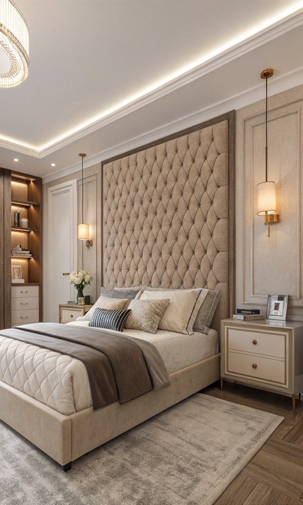 A plush or fabric-covered headboard adds sophistication and visual comfort.