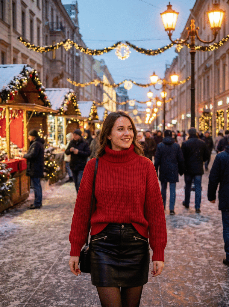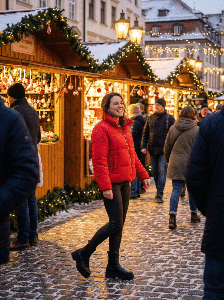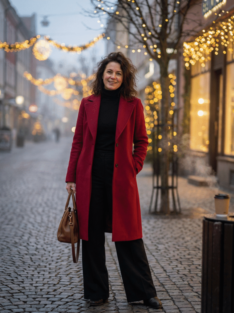 A red coat is the star, perfect for winter outings or Christmas markets.
