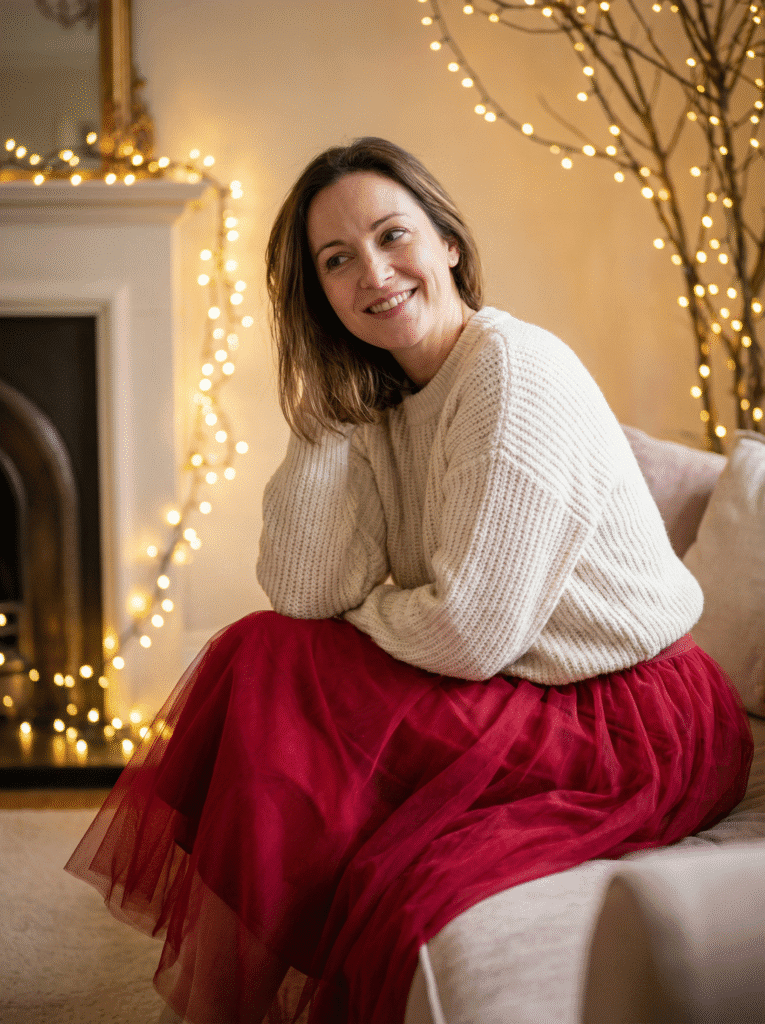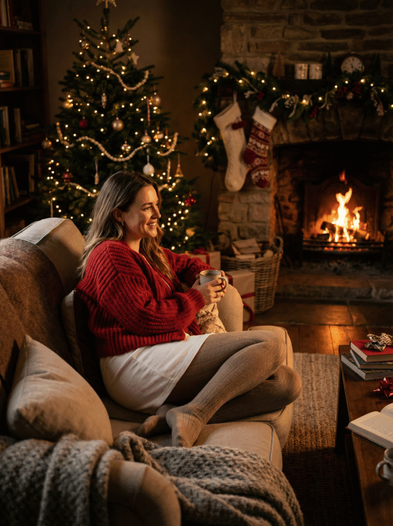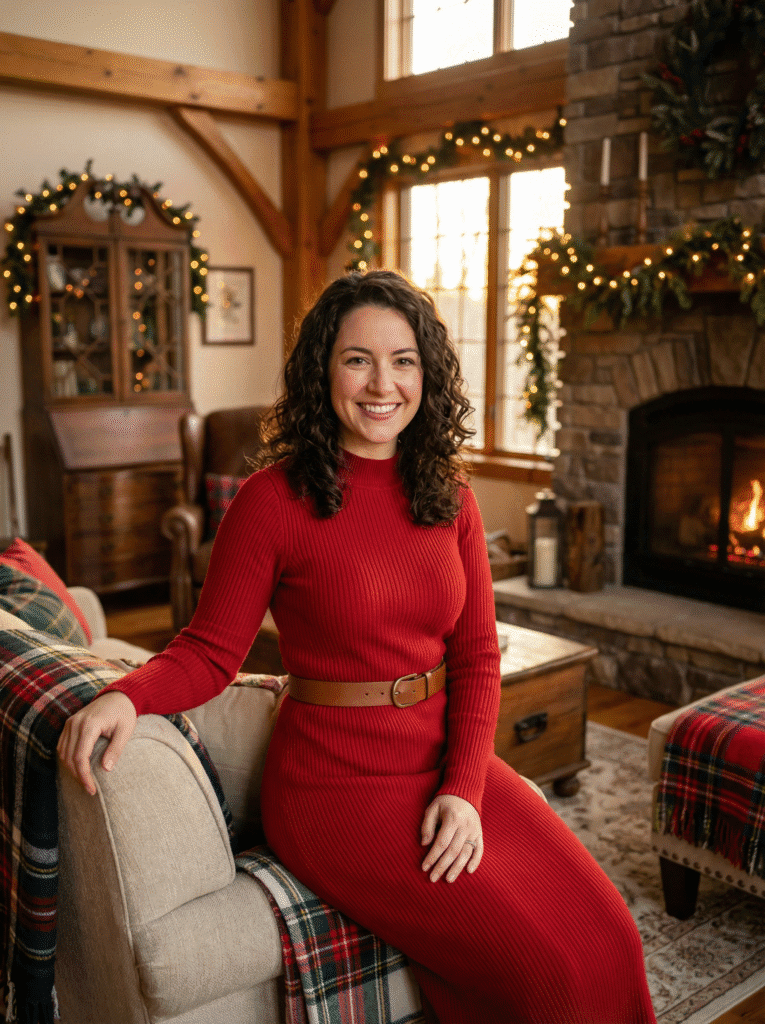 This look gives cozy warmth with a touch of softness. Perfect for intimate family gatherings or Christmas morning photos.