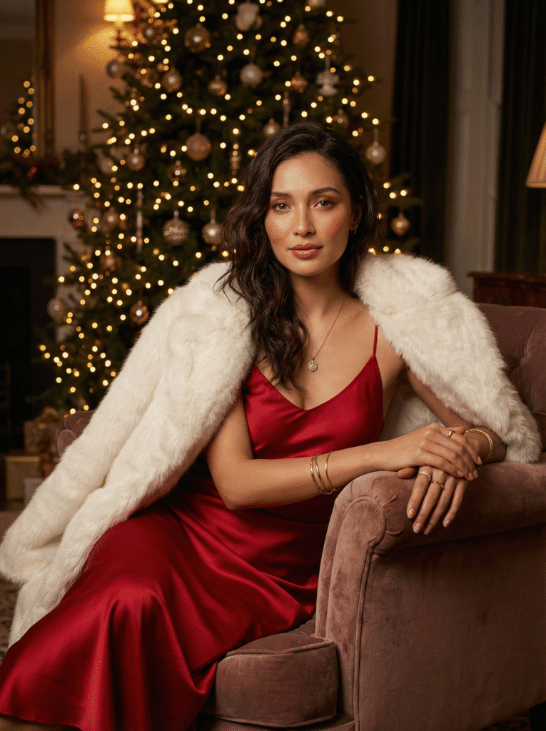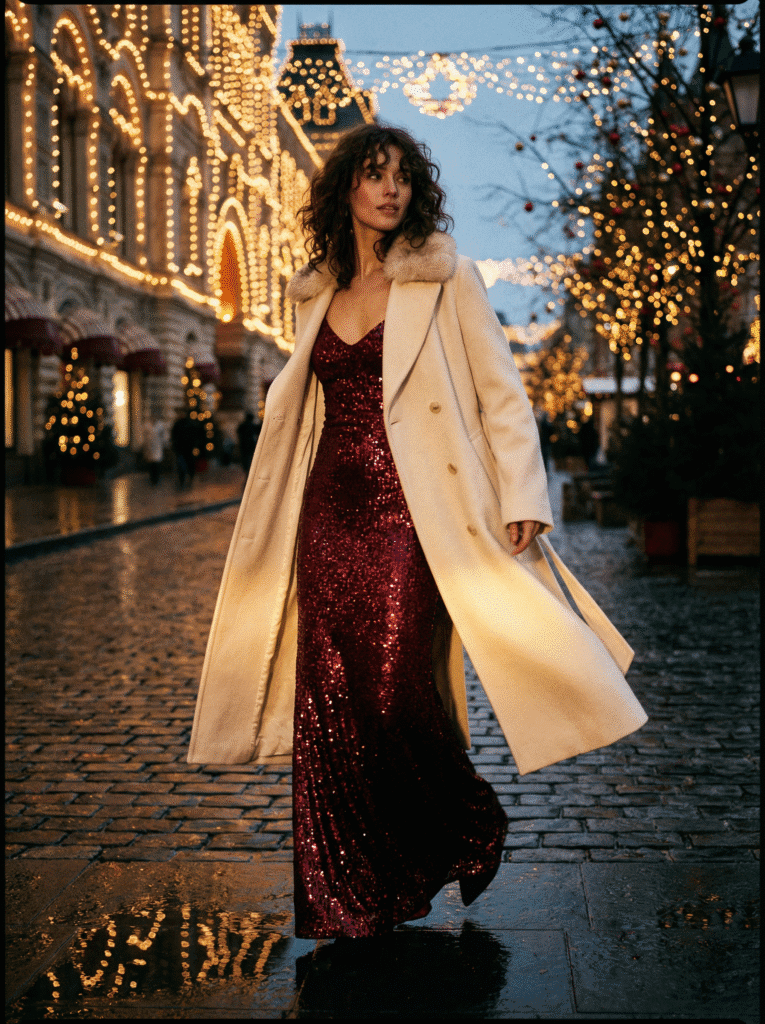 A timeless “dress to impress” choice. The red satin creates natural movement and glow, while the faux fur brings winter luxury. This combo works for Christmas Eve dinner, date nights, or formal events.