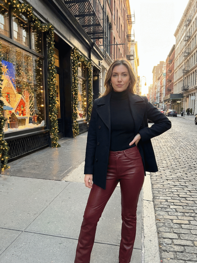 ⭐ IDEA 15 — Red Leather Pants + Black Turtleneck