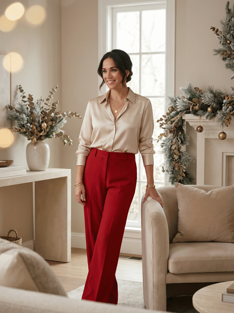 ⭐ IDEA 5 — Red Wide-Leg Pants + Satin Blouse