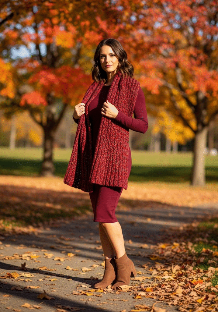Feminine and fitted but balanced with cozy accessories. Choose rust, burgundy, or mocha tones.