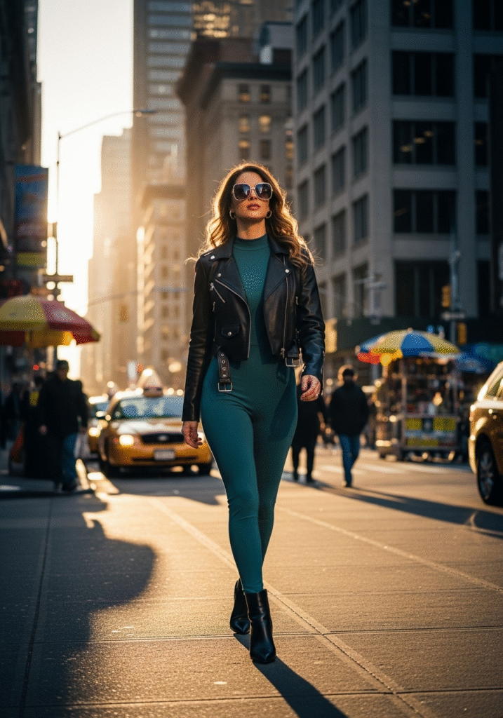 Go bold with a sleek jumpsuit and a cropped moto jacket. Add layered necklaces for a dressed-up vibe.