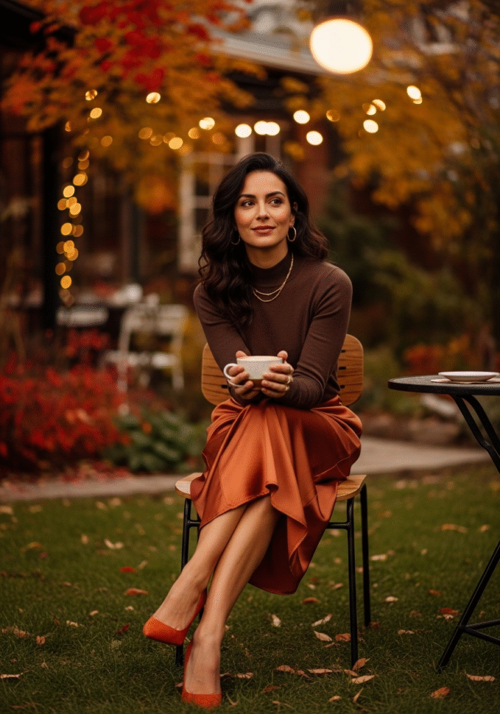 Cozy and classic, this look never fails. Choose a chunky cream or burnt orange sweater paired with high-waisted skinny jeans and tan ankle boots. Add a statement belt or gold hoops to elevate it.