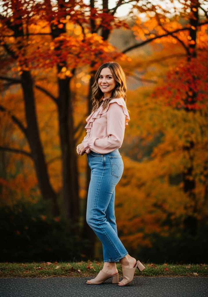 13. Ruffled Blouse + Straight-Leg Jeans + Mules
