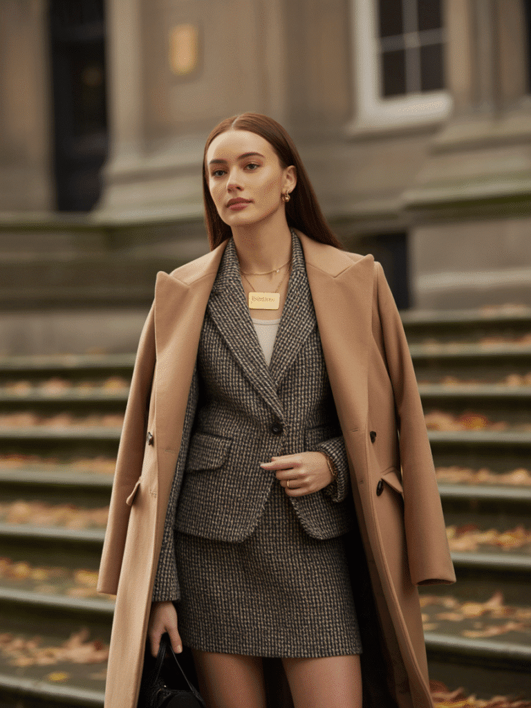 Go for a preppy vibe with a tweed blazer and skirt set layered under a tailored wool coat. Add loafers or ankle boots for polish.