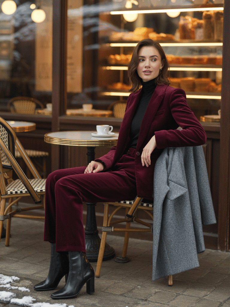 For bold winter tailoring, a velvet suit delivers luxury and warmth at once.