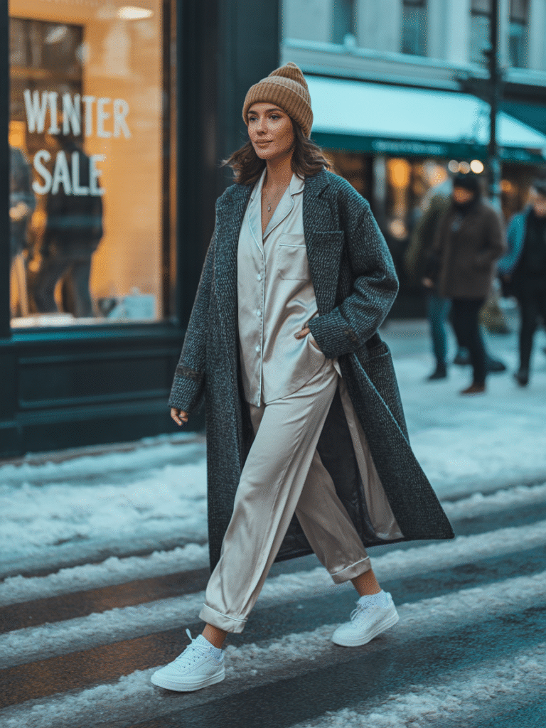 Streetwear meets comfort with a silk pajama set styled under a structured coat and sneakers.