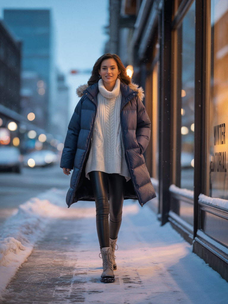 Edgy and practical—leather leggings styled with an oversized knit and a puffer coat create the perfect blend of comfort and cool.