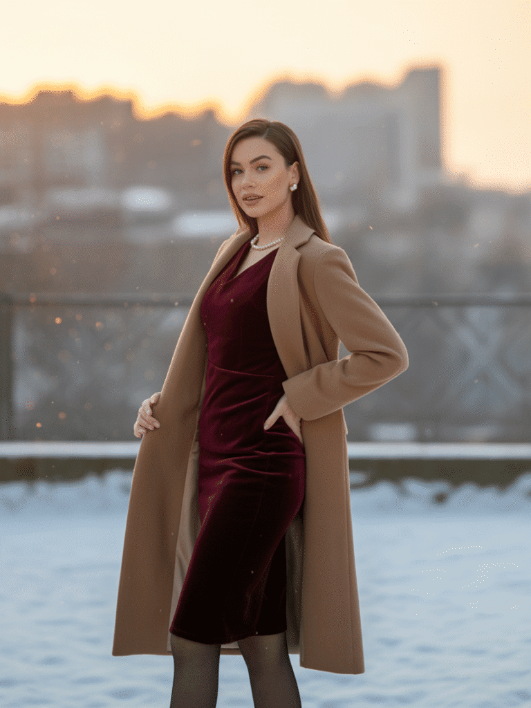Velvet instantly elevates your outfit. Style a velvet midi dress with tights, a long wool coat, and heeled boots for evening-ready winter glamour.