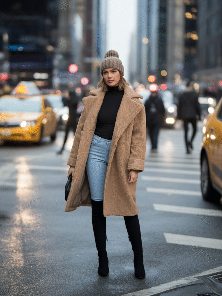 A teddy coat is the ultimate winter staple—plush, oversized, and effortlessly cool. Pair it with a simple turtleneck, jeans, and over-the-knee boots for a cozy street-style look.