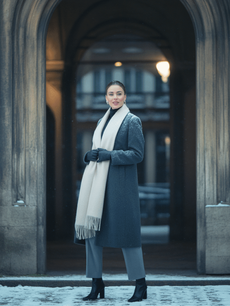 Go bold with statement accessories like opera gloves and a voluminous scarf over a sleek coat.